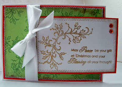 My first challenge is a Sketch Challenge.(EHWCMD2) I used my new stamps from Gina K. Designs " A Very Merry Christmas " set by Theresa Momber. The paper is a digi paper also designed by Theresa "Deck the Halls . I stamped the image with Craft Ink and heat embossed it with Gold embossing powder. I added a couple of Rhinestones and White Satin Ribbon (Offray).