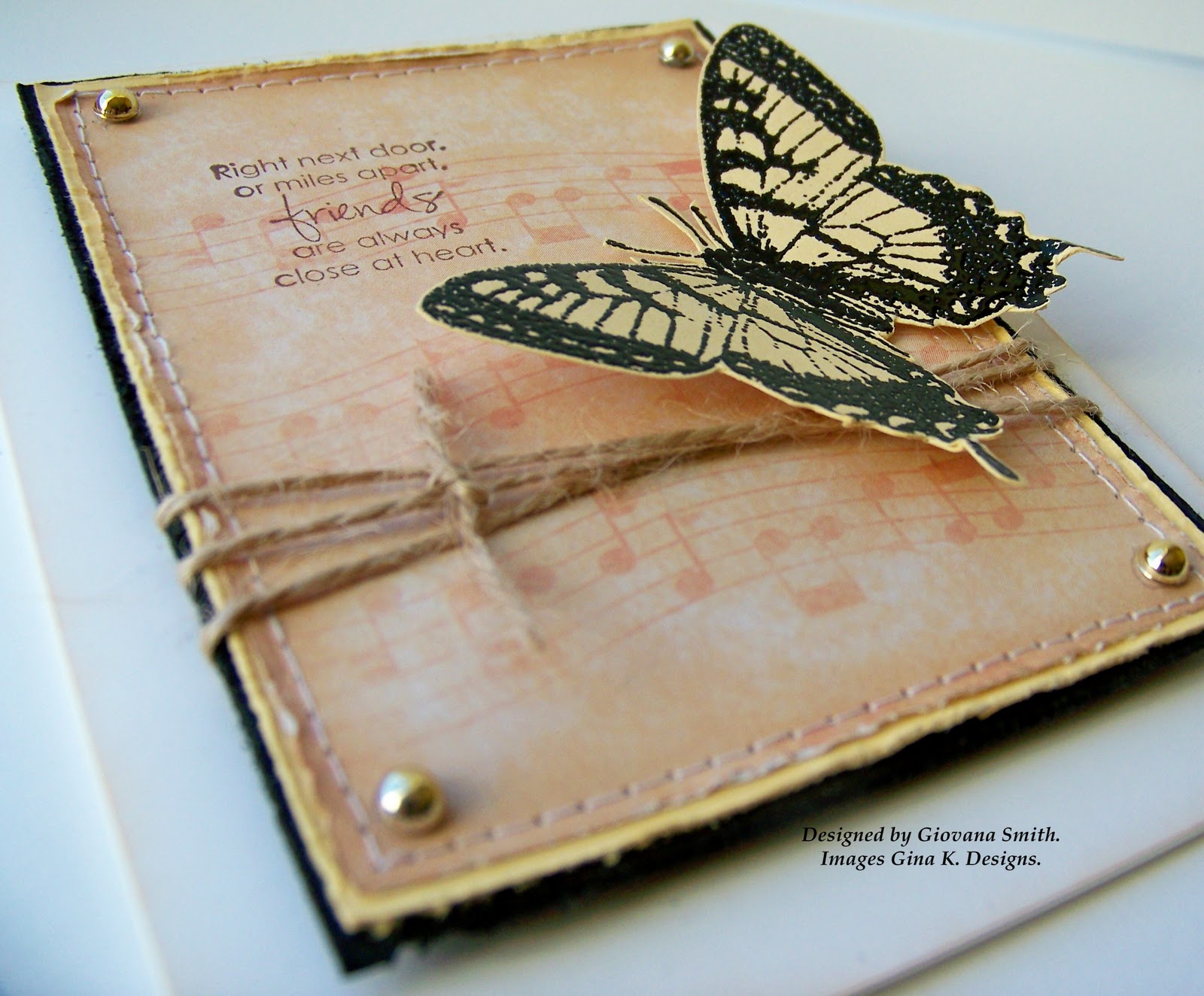 For my card I used Gina K new Digital paper "Double Dots", I stamped the butterfly in Kraft CS, I used 2 colors: Antique linen first and then Tea Dye, after that I added some Clear ep and heat embossed. I added some Green Lime Satin Ribbon and a fuzzy felt flower with a black rhinestone. The sentiment is from Botanicals.