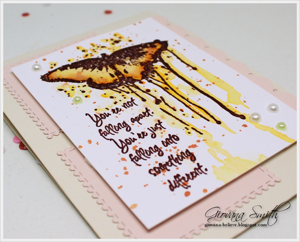 For this card I again created a background using Color Burst on a piece of watercolor paper. Then die-cut the piece using scallop rectangle dies, also die-cut the inner part of the piece using cloud dies. Stamped the sentiment using the MISTI and Jet Black ink. Adhered a piece of foam behind the piece and added it to card base. Adhered more foam behind the clouds to create more dimension. After that, I added the croc on top of the cloud and few pieces of foam adhesive behind it,a dded the heart and blue rhinestones.